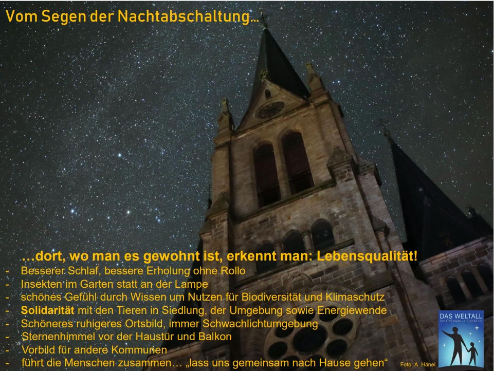 Vorteile der Nachtabschaltung und Umgang mit Unbehagen: Dort findet man auch Informationen zu den Vorteilen der Nachtabschaltung und dem Umgang mit Unbehagen, das manche Menschen verspüren: Hessisches Netzwerk gegen Lichtverschmutzung – Vorteile und Strategien gegen Unbehagen (lichtverschmutzung-hessen.de)