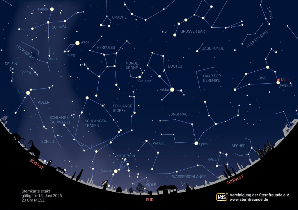 Von Jupiter müssen wir uns nun verabschieden, aber Mars gibt tapfer seine Abschiedsvorstellung. Noch ist er rückläufig im Sternbild Löwen zu sehen – immer in der Nähe von Regulus, dem Hauptstern des Löwen. Merkur zeigt sich ab Mitte Juni zwar tief im Westhimmel, aber er verbringt seine Zeit lieber im Sonnenlicht und ist schwer auszumachen. Dafür beherrscht die Venus mit ihrem Glanz den Morgenhimmel. Ihre Aufgangszeit verlagert sich von 3h36m am Monatsanfang auf 2h53m am Monatsende.