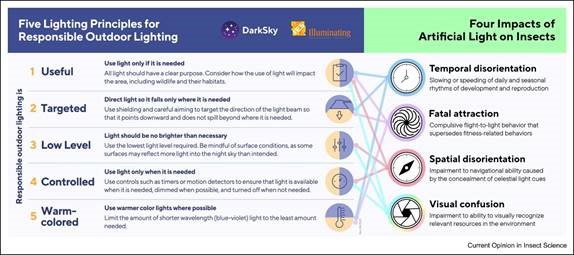 In Bezug auf künstliche Beleuchtung wird oft der Begriff „insektenfreundlich“ verwendet. Dabei ist dieser Begriff nicht nur höchst problematisch, er ist auch irreführend und im Zusammenhang mit nächtlichem Kunstlichteinsatz schlichtweg falsch und verharmlosend. Denn zahlreiche Auswertungen zu Kunstlicht und Insekten (Auswertung von Untersuchungen zum Thema Kunstlicht und Insekten) sowie eine in 2024 veröffentlichte Studie (https://doi.org/10.1016/j.cois.2024.101276) zeigen klar auf, dass nur kein Kunstlicht ohne Einfluss auf das Verhalten von Insekten bleibt. Das bedeutet, dass alle technischen Anforderungen, die man zur Reduzierung der Auswirkungen an eine Kunstlichtquelle vornehmen kann wie Abstrahlgeometrie, Farbtemperatur, Lichtstrom (Intensität) und Lichtpunkthöhe dennoch jeweils auf unterschiedliche Weise negative Auswirkungen auf Insekten haben und in der Folge kaskadenartig auf andere Arten wie Fledermäuse, Vögel, Igel etc. Das heißt, es gibt keine künstliche Beleuchtung, die ohne schädliche Auswirkungen bleibt. Im Besten fall kann man notwendige Beleuchtung „mehr oder weniger insektenschonend“ einsetzen, im Ergebnis ist jedoch jedes Kunstlicht im Freien „insektenschädigend“.