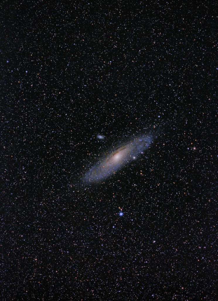 Unterhalb ist der einzige Planet der ersten Nachthälfte, Saturn, gut auszumachen. Kassiopeia, das berühmte Himmels-W hat nun fast den Zenit erklommen und mit Hilfe ihrer markanten Form und der des Herbstvierecks findet man nun auch unsere Nachbargalaxie Andromeda. Sie befindet sich in 2,5 Mio Lichtjahren Entfernung – und ist ohne Lichtverschmutzung mit bloßen Auge erkennbar. Besser natürlich mit Fernglas – dann erkennt man schon Details. Ein herbstlicher Genuss – wenn man sich die räumlichen Dimensionen vor Augen hält und davon ausgehen kann, dass unser eigene Heimatgalaxie – die Milchstraße – von außen vermutlich sehr ähnlich aussieht. Genau wissen wir es nicht, denn uns bleibt die Innenansicht. Die Andromeda-Galaxie und die Milchstraße sind Mitglieder der sogenannten Lokalen Gruppe, die aus mehreren Galaxien und Nebeln besteht.