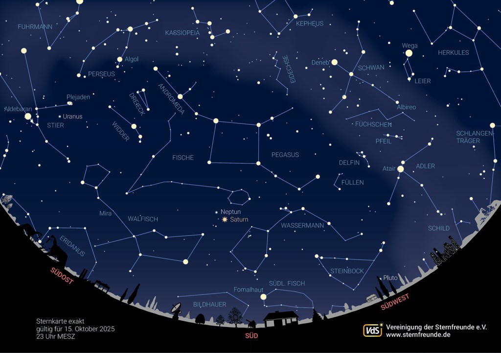 „Auch der Himmel, der besternte, schenkt zur Herbstzeit reiche Ernte!“ reimt der Sternenpoet Roland Müller und trifft den berühmten Nagel auf den Kopf. Denn nun im Oktober ist das funkelnde Sternenzelt wieder viel besser erreichbar als im Sommer, wenn es durch die künstliche Sommerzeit viel zu spät dunkel wird.