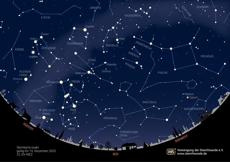 Mit Neumond am 20. Dezember wird die Weihnachtswoche dann von der zunehmenden Mondsichel verschönert. Den gesamten Dezember über sieht man auch den strahlend hellen Planeten Jupiter in den Zwillingen am Osthimmel und Saturn im Südwesten. Am Himmel lassen sich die Planeten und Sterne gut unterscheiden – den Planeten funkeln nicht.