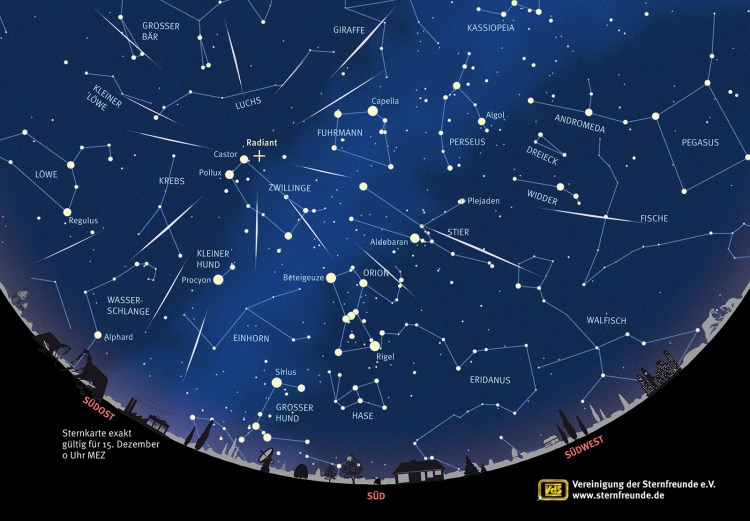 Sternschnuppen – himmlisches Licht ohne Plastik Wer sich nicht selbst mit leuchtenden Plastikprodukten den Sternenhimmel raubt, für den bietet der Dezember einen der spektakulärsten Meteorströme: die Geminiden mit ihrem Fluchtpunkt im Sternbild der Zwillinge, lateinisch Gemini. Rund um das Maximum am 13. Dezember mit durchschnittlich um die 50 Sternschnuppen pro Stunde sind sie vom 4. bis 20. Dezember aktiv und bieten als Überbleibsel des Asteoriden (3200) Phaeton typischerweise die hellsten Sternschnuppen nach dem Maximum. Das Schöne an den Geminiden ist, dass ihr Fluchtpunkt im Sternbild Zwillinge die ganze Nacht über sichtbar ist, weshalb man schon ab den frühen Abendstunden Sternschnuppen sieht.