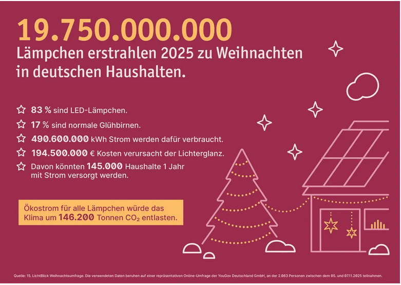 Obwohl LED-Leuchten im Vergleich zu den früheren Glühbirnen weniger Strom verbrauchen, ist in Summe der Energieverbrauch hoch, zumal durch die billigen Plastiklichter aus Fernost mehr und länger beleuchtet wird. In diesem Jahr könnten laut Medienberichten über 194 000 Haushalte ganzjährig mit dem für die Weihnachtsbeleuchtung benötigten Strom versorgt werden – knapp 500 Mio kWh. https://www.lichtblick.de/weihnachtsumfrage/ Problematisch sind auch der hohe Verbrauch an nicht recycelbarem Kunststoff und der Einsatz von Weichmachern bei der Herstellung von Lichterketten, damit diese biegbar sind.
