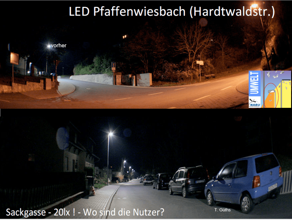 Die Aufnahmen oben verdeutlichen das Problem. Vorher eine NAV (Natriumbeleuchtung) mit geringen Blauanteilen, die schon sehr lange als besonders schädliche identifziert sind, auf grelle 4000 Kelvin. https://naturnacht-fulda-rhoen.de/ressourcen/sammlung-auswirkungen-von-kunstlicht-bei-nacht/Abgesehen vom Blauanteil stellt sich auch die Frage nach der Ästhetik.