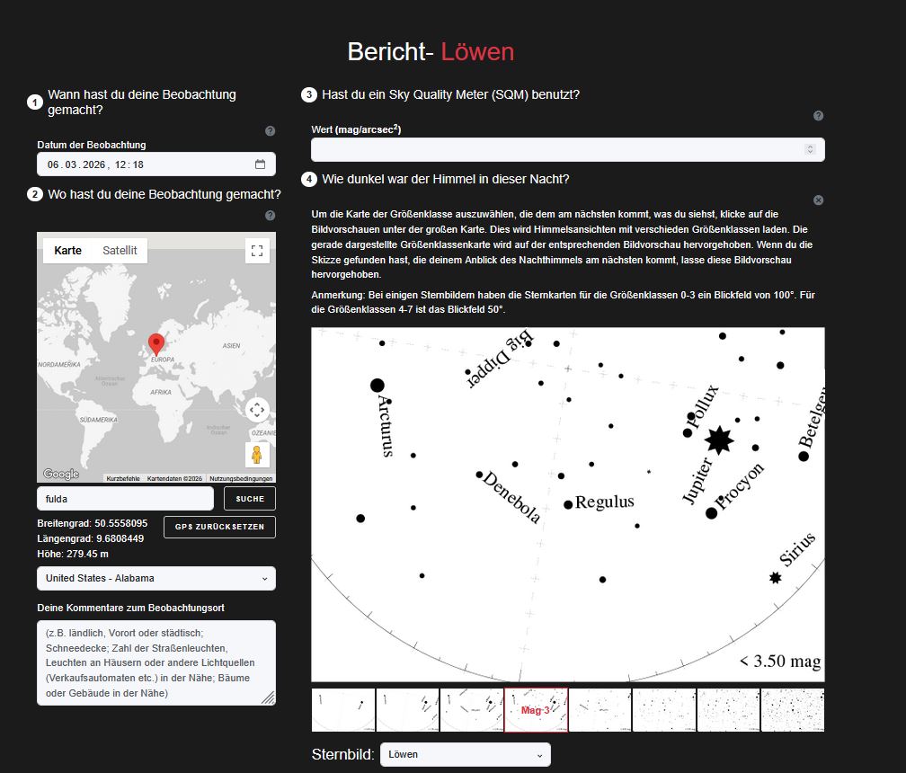 - Rufen Sie mit dem Smartphone die Seite Globe at Night https://app.globeatnight.org/ auf. Zunächst gibt man Datum und Standort an. Das ist wichtig, denn sonst bekommt man den Sternenhimmel eventuell spiegelverkehrt angezeigt.