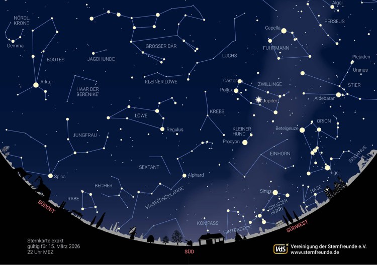 Nicht nur wird es in dieser Jahreszeit noch früh dunkel und sternreich. In den kommenden Nächten bieten sich in der Rhön und Umgebung besonders gute Bedingungen: Ein stabiles Hochdruckgebiet sorgt für klare Nächte mit guter Sicht auf die Sterne. Gleichzeitig nimmt die Helligkeit des Mondes weiter ab – bis zum nächsten Neumond am 19. März wird der Nachthimmel zunehmend dunkler.
