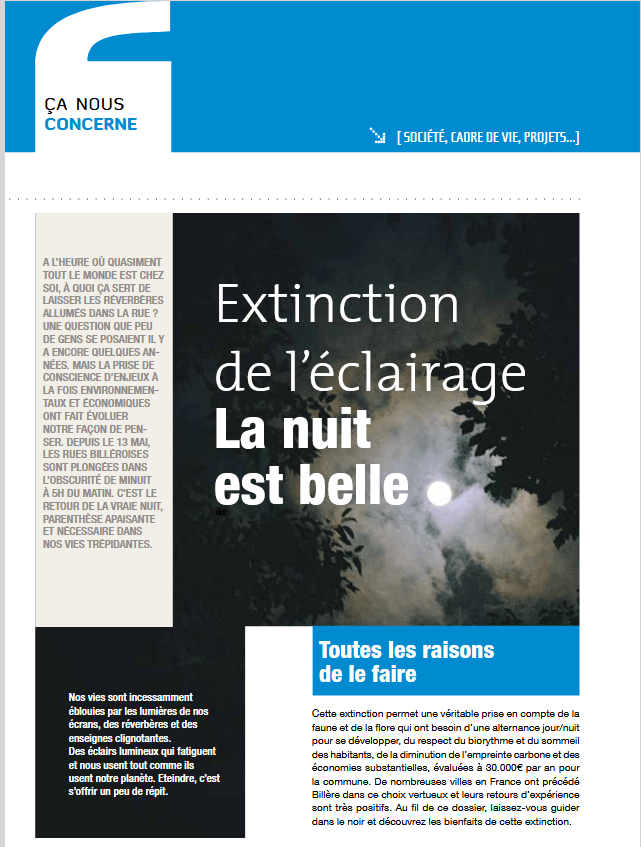 „Wir schalten ab – die Nacht ist schön.“, Magazin der Stadt Biliere in Frankreich. Wieso man der Abschaltung viel Gutes abgewinnen kann, kann man hier nachlesen.